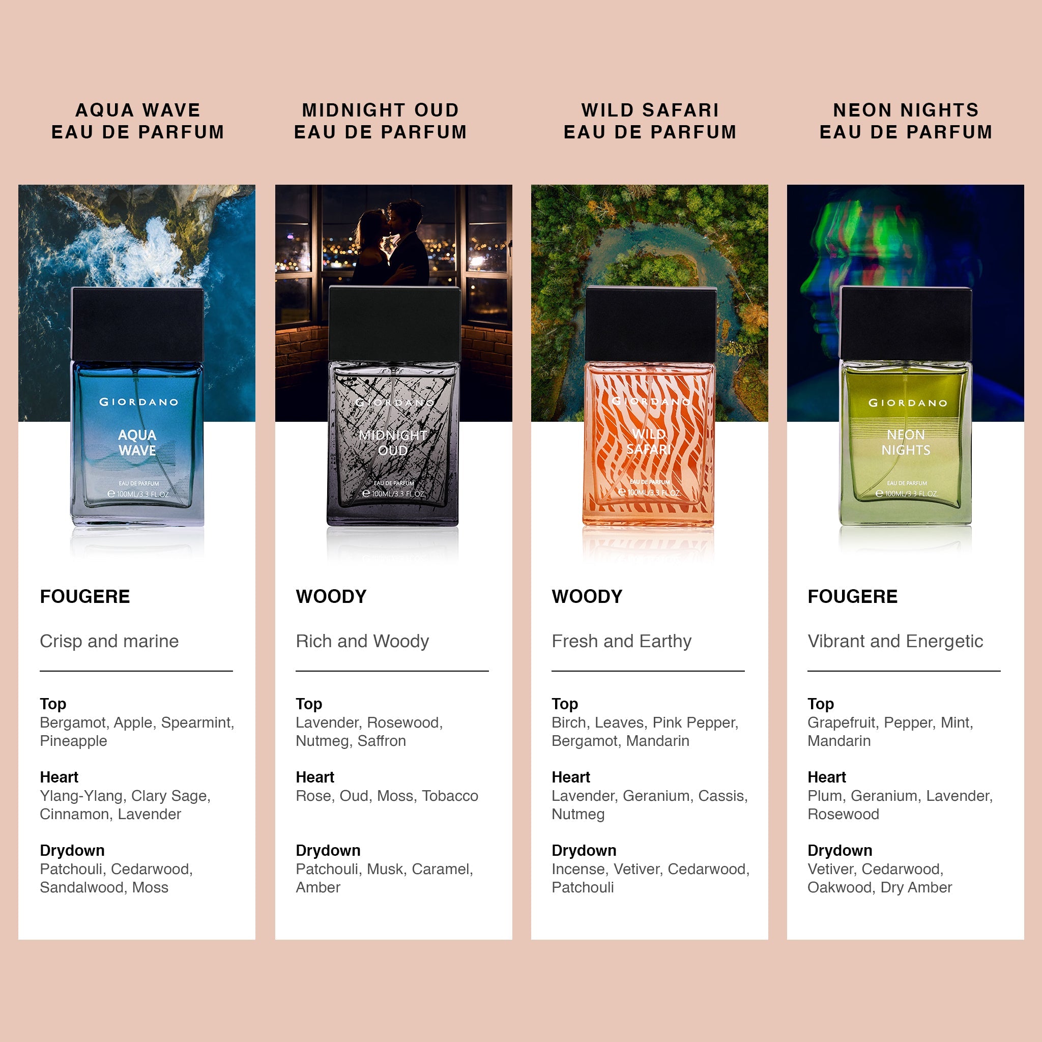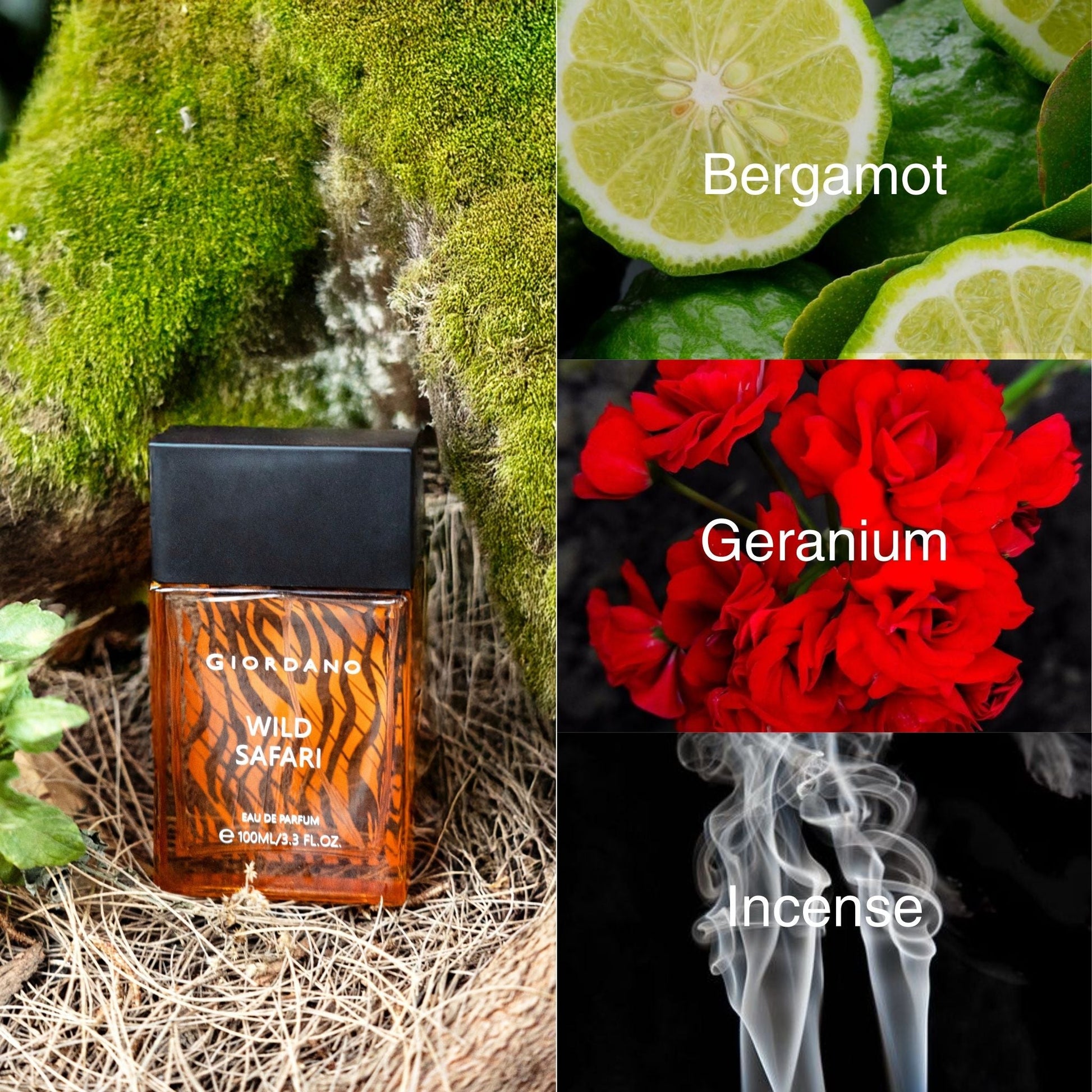 Wild Safari captures the thrill of exploration with bold birch, fresh leaves, pink pepper, and citrus notes of bergamot and mandarin. The heart reveals lavender, geranium, cassis, and nutmeg, while the base deepens with incense, vetiver, cedarwood, and patchouli.